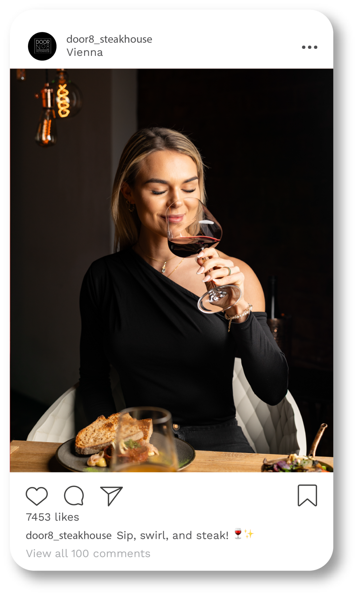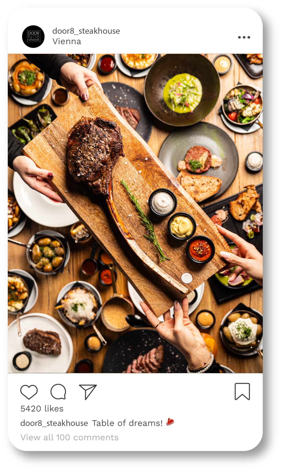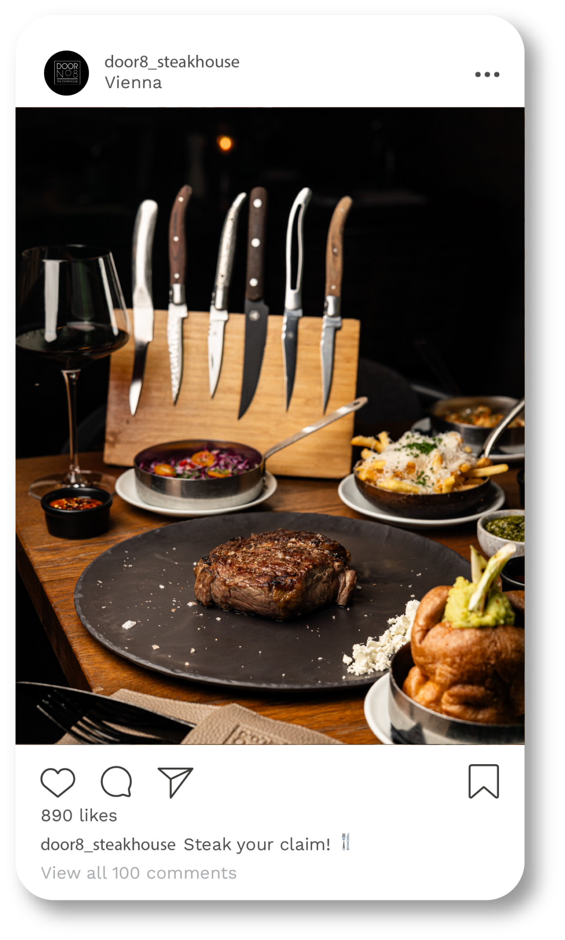 Door No. 8 – Wo Genuss und Geselligkeit aufeinandertreffen. Wir bringen die Atmosphäre des Steakhouse mit einzigartigen Fotos, kreativen Reels und einem starken Social Media Auftritt direkt zu den Followern.