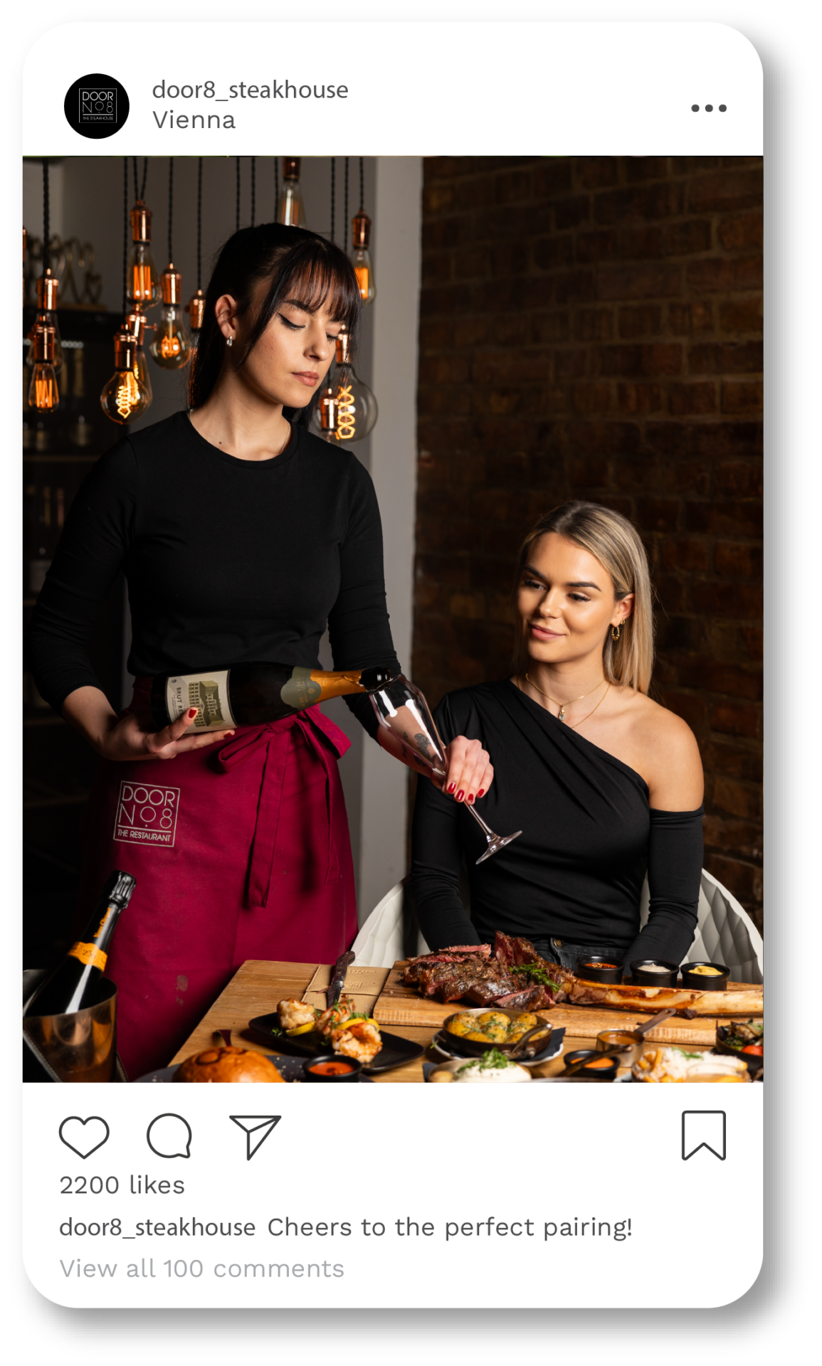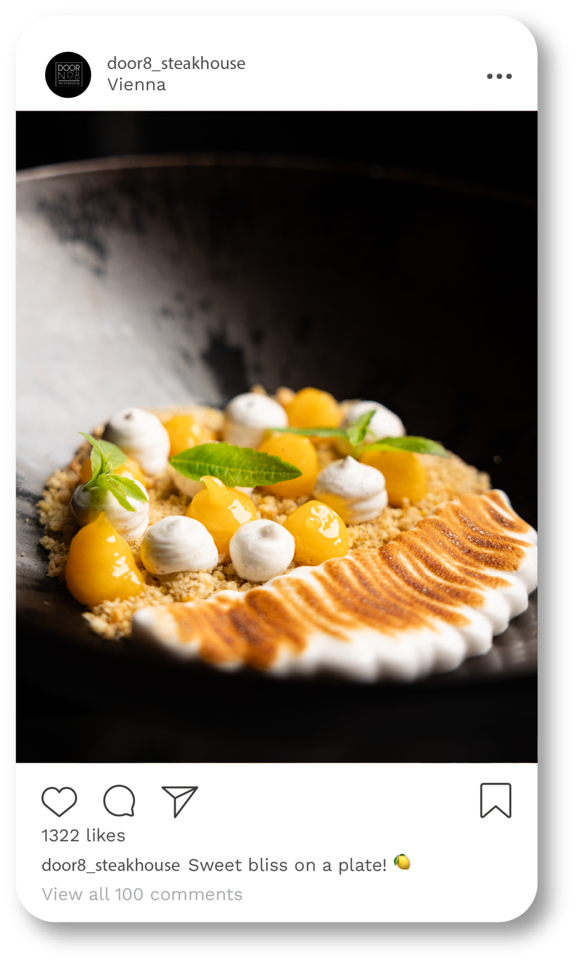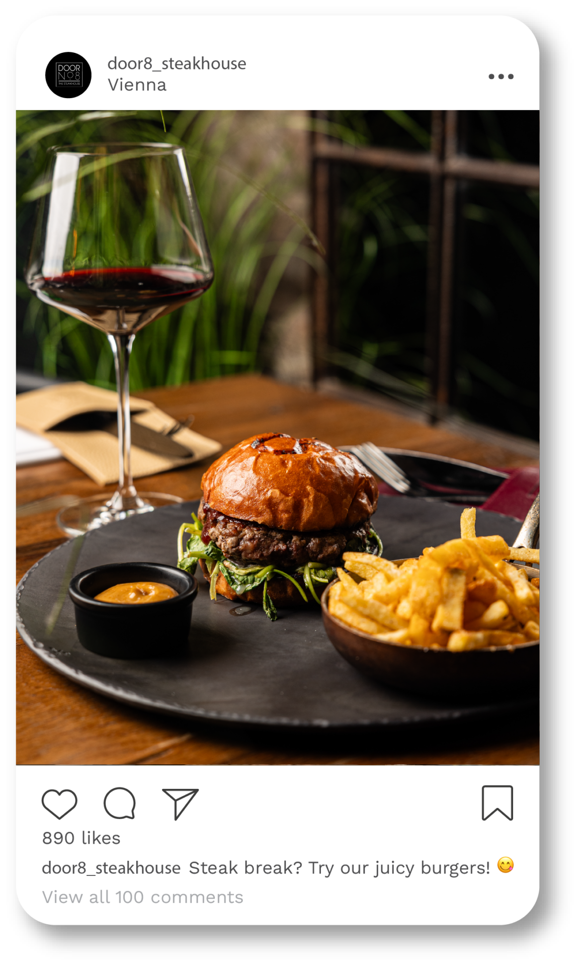 Door No. 8 – Wo Genuss und Geselligkeit aufeinandertreffen. Wir bringen die Atmosphäre des Steakhouse mit einzigartigen Fotos, kreativen Reels und einem starken Social Media Auftritt direkt zu den Followern.