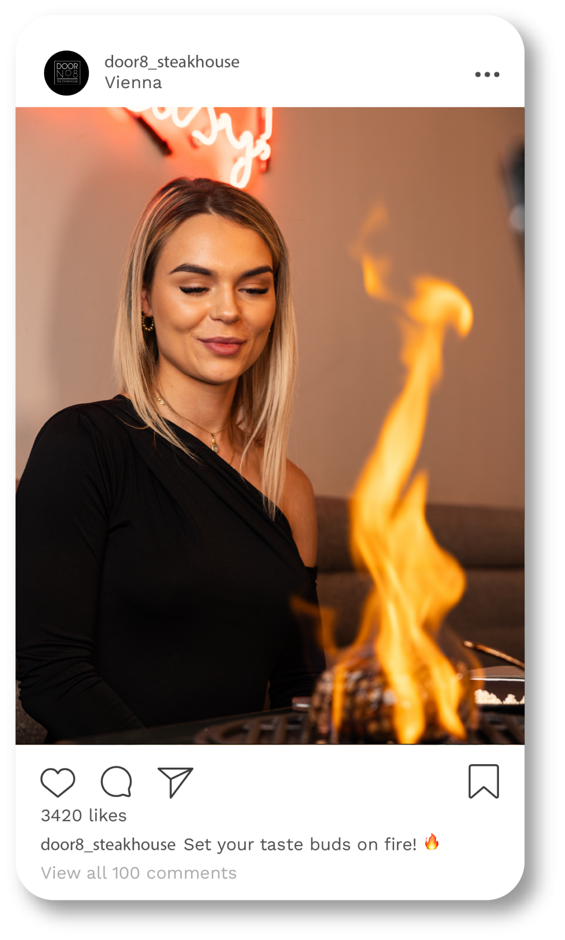 Ob perfekt gegrillte Steaks, erlesene Drinks oder unvergessliche Abende – wir setzen das Door No. 8 gekonnt in Szene. Genuss, Atmosphäre und Leidenschaft – authentisch präsentiert!